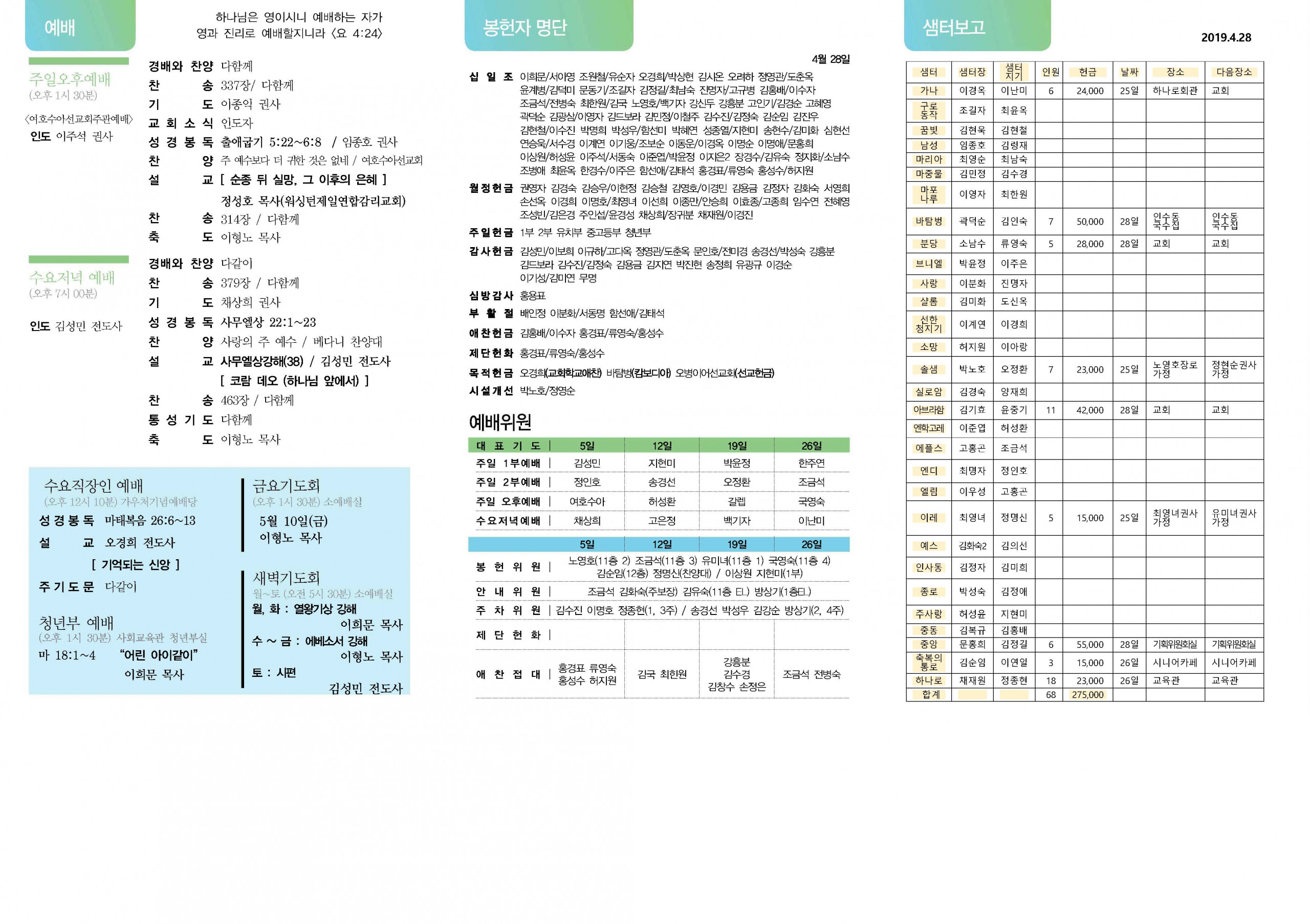 교회소식 교회소식주보 교회소식 주보 교회소식주보 2019년 5월 5일 주일주보 주보 2019-05-04 김성민 첨부파일 중앙교회_주보(2019)_thumnail.jpg 중앙새주보_190505_페이지_2.jpg 중앙새주보_190505_페이지_1.jpg 목록 이전 :: 2019년 4월 28일 주일... 2019년 5월 12일 주일... :: 다음