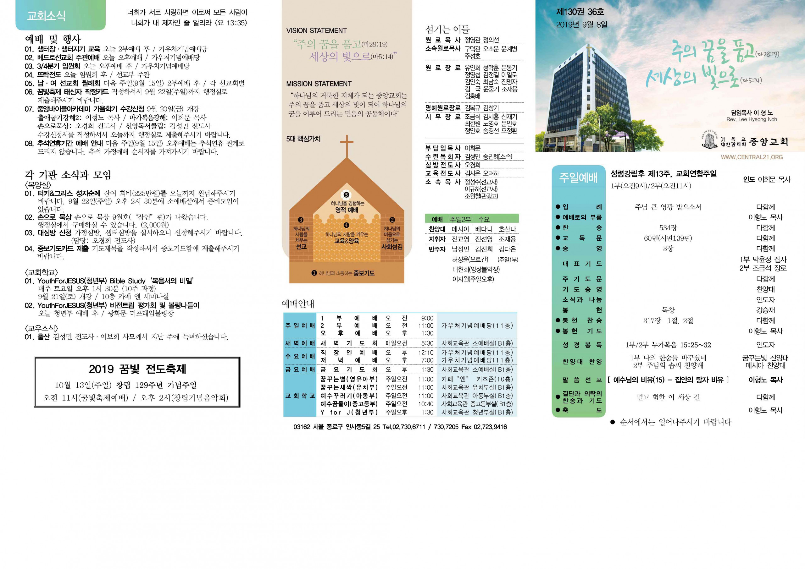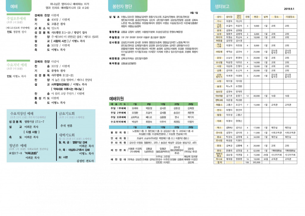교회소식 교회소식주보 교회소식 주보 교회소식주보 2019년 9월 8일 주일주보 주보 2019-09-07 김성민 . 첨부파일 중앙교회_주보(2019)_thumnail.jpg 중앙새주보_190908_페이지_2.jpg 중앙새주보_190908_페이지_1.jpg 목록 이전 :: 2019년 9월 1일 주일... 2019년 9월 15일 주일... :: 다음
