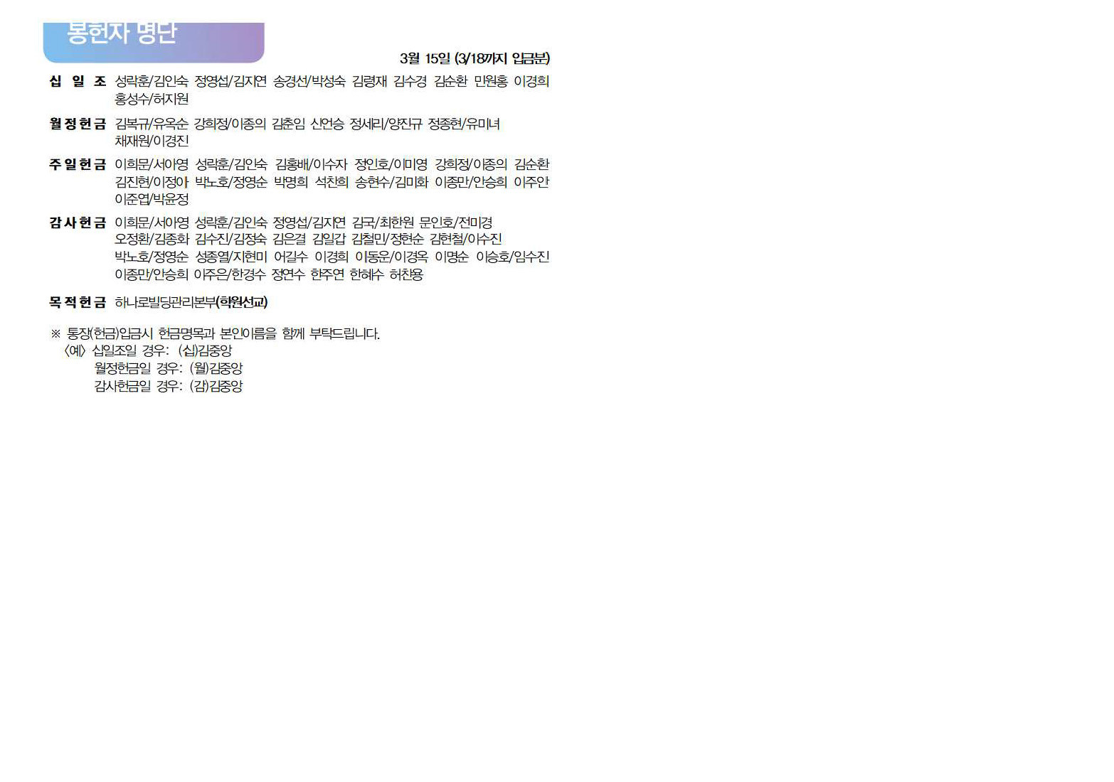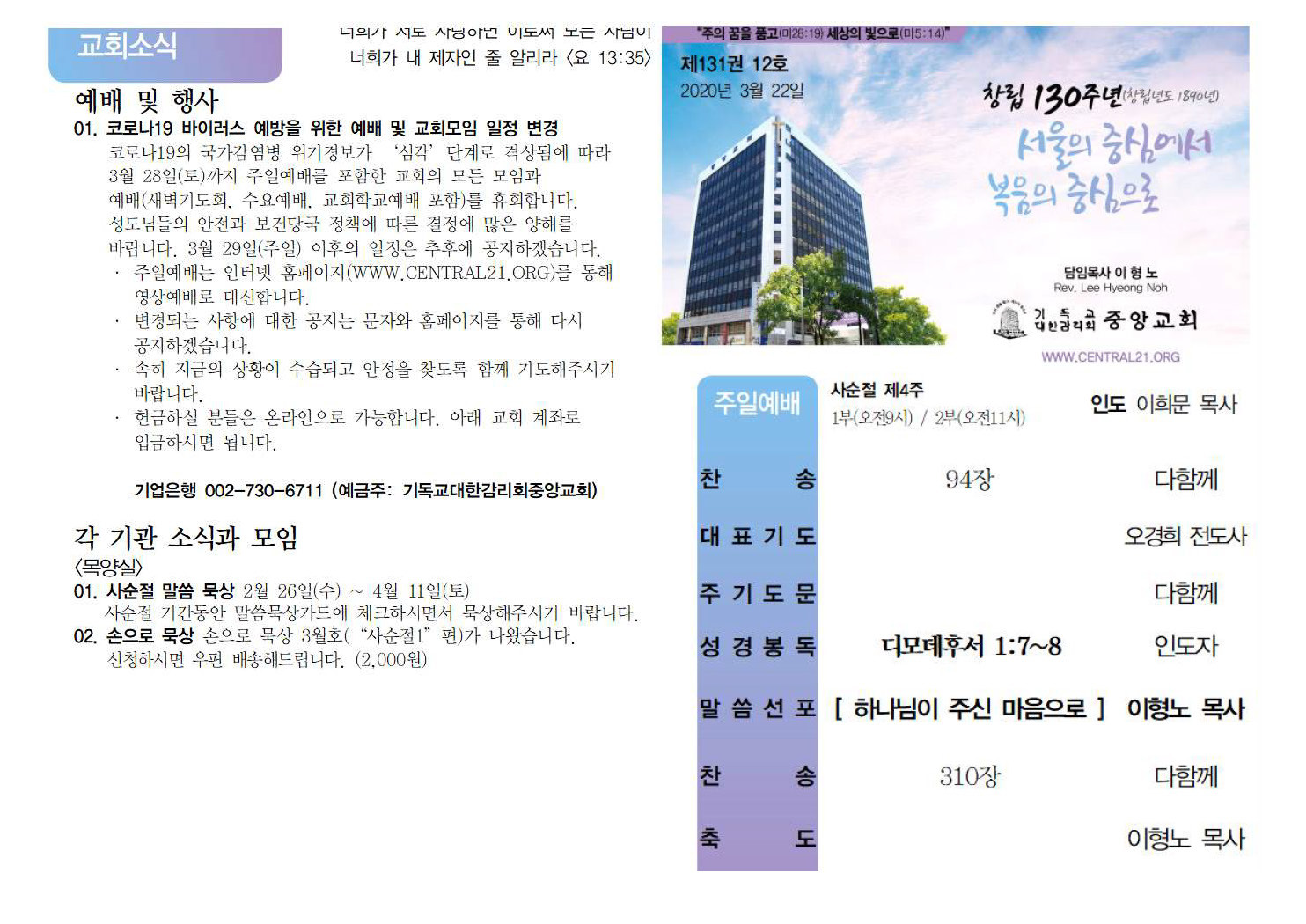 교회소식 교회소식주보 교회소식 주보 교회소식주보 2020년 3월 22일 주일주보 주보 2020-03-22 김성민 첨부파일 2020주보.PNG 빈 문서 1_페이지_2.jpg 빈 문서 1_페이지_1.jpg 목록 이전 :: 2020년 3월 15일 주일... 2020년 3월 29일 주일... :: 다음