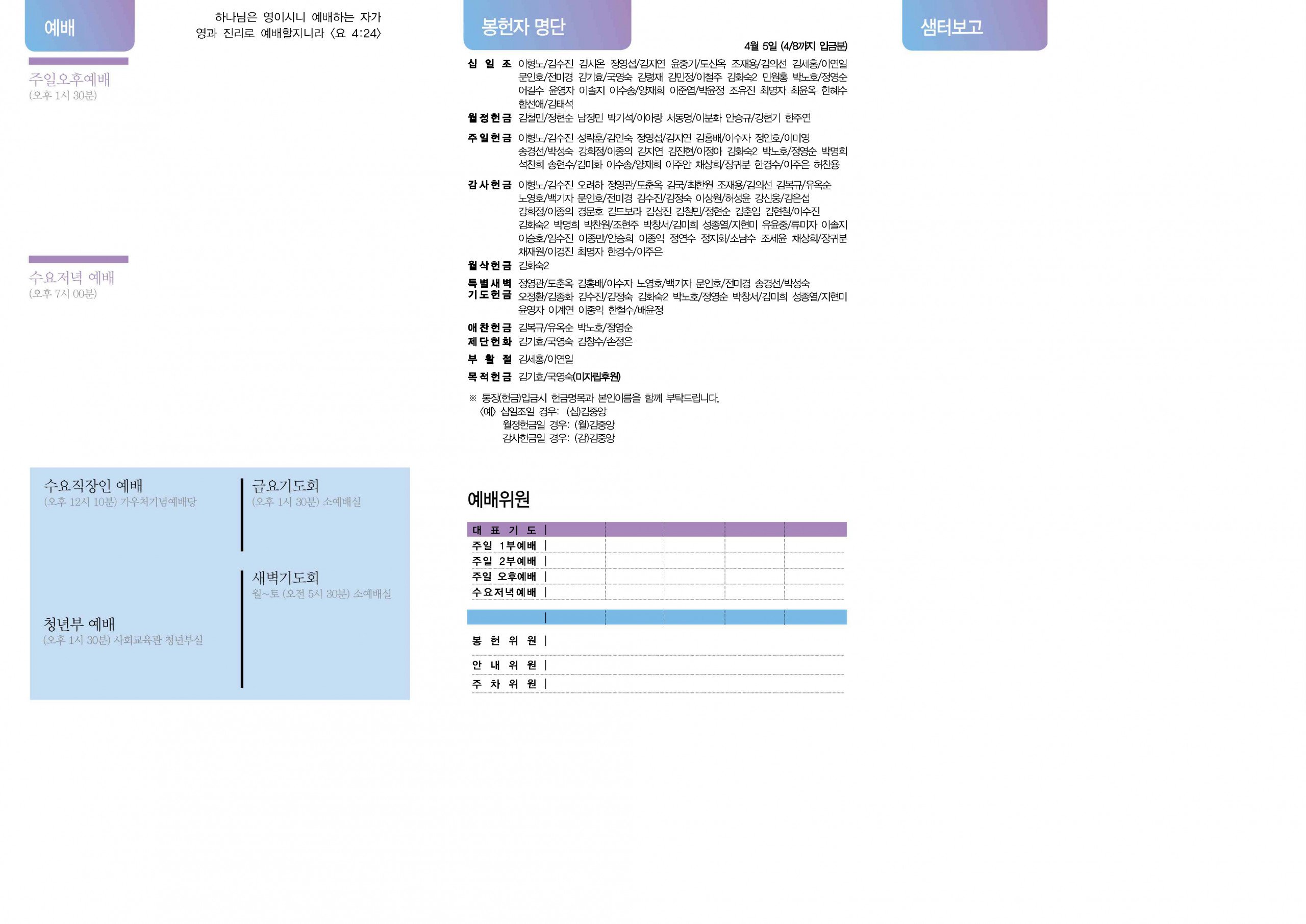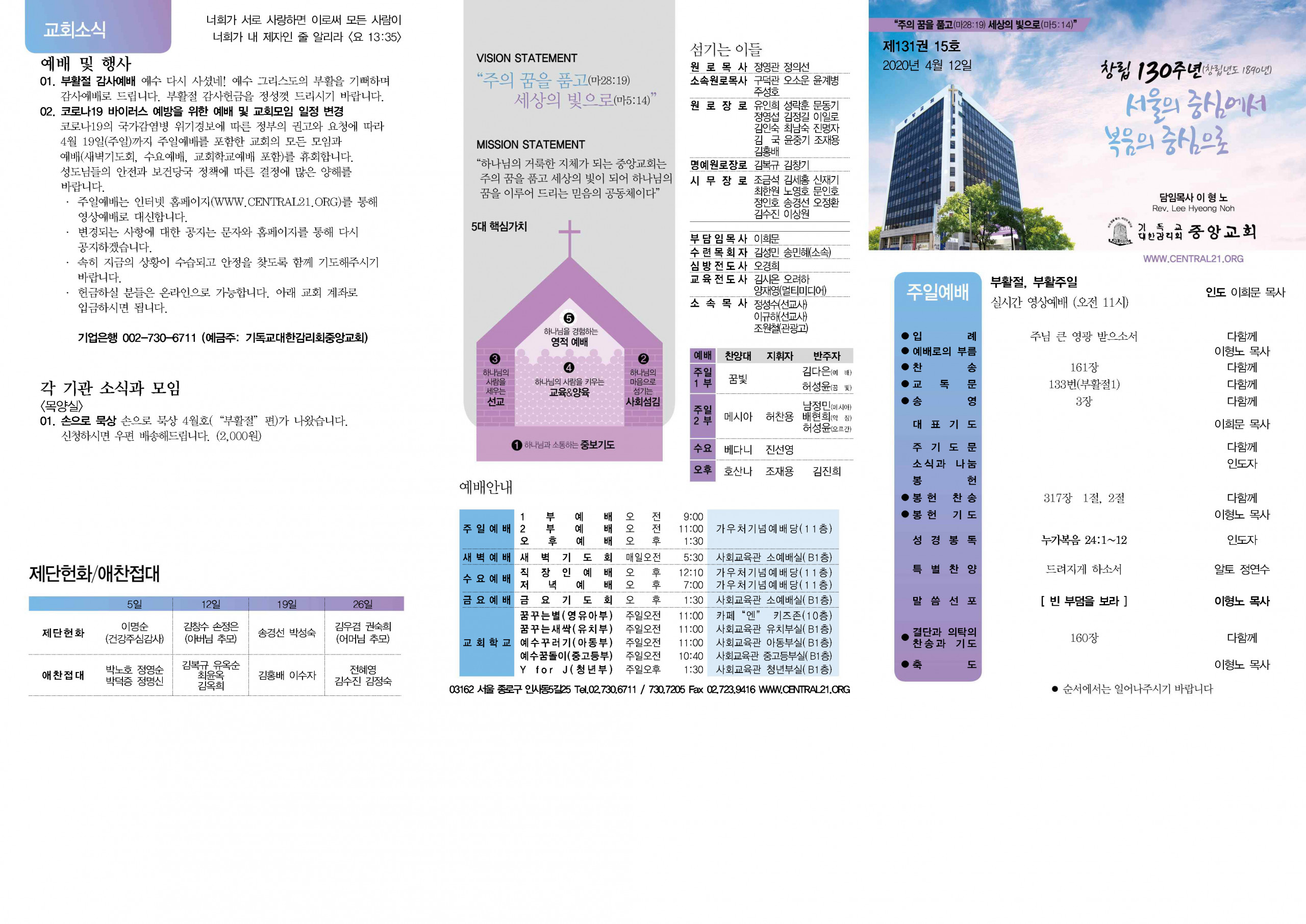 교회소식 교회소식주보 교회소식 주보 교회소식주보 2020년 4월 12일 주일주보 주보 2020-04-12 김성민 첨부파일 2020주보.PNG 중앙새주보_20200412_페이지_2.jpg 중앙새주보_20200412_페이지_1.jpg 목록 이전 :: 2020년 고난주간 감람... 2020년 4월 19일 주일... :: 다음