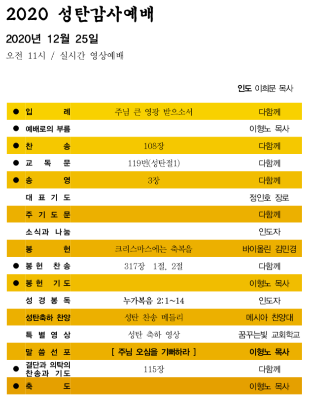교회소식 교회소식주보 교회소식 주보 교회소식주보 2020년 12월 25일 주보 주보 2020-12-25 김성민 첨부파일 2020주보썸네일.PNG tddd.png 1225광고.png 목록 이전 :: 2020년 12월 20일 주... 2020년 12월 27일 주... :: 다음