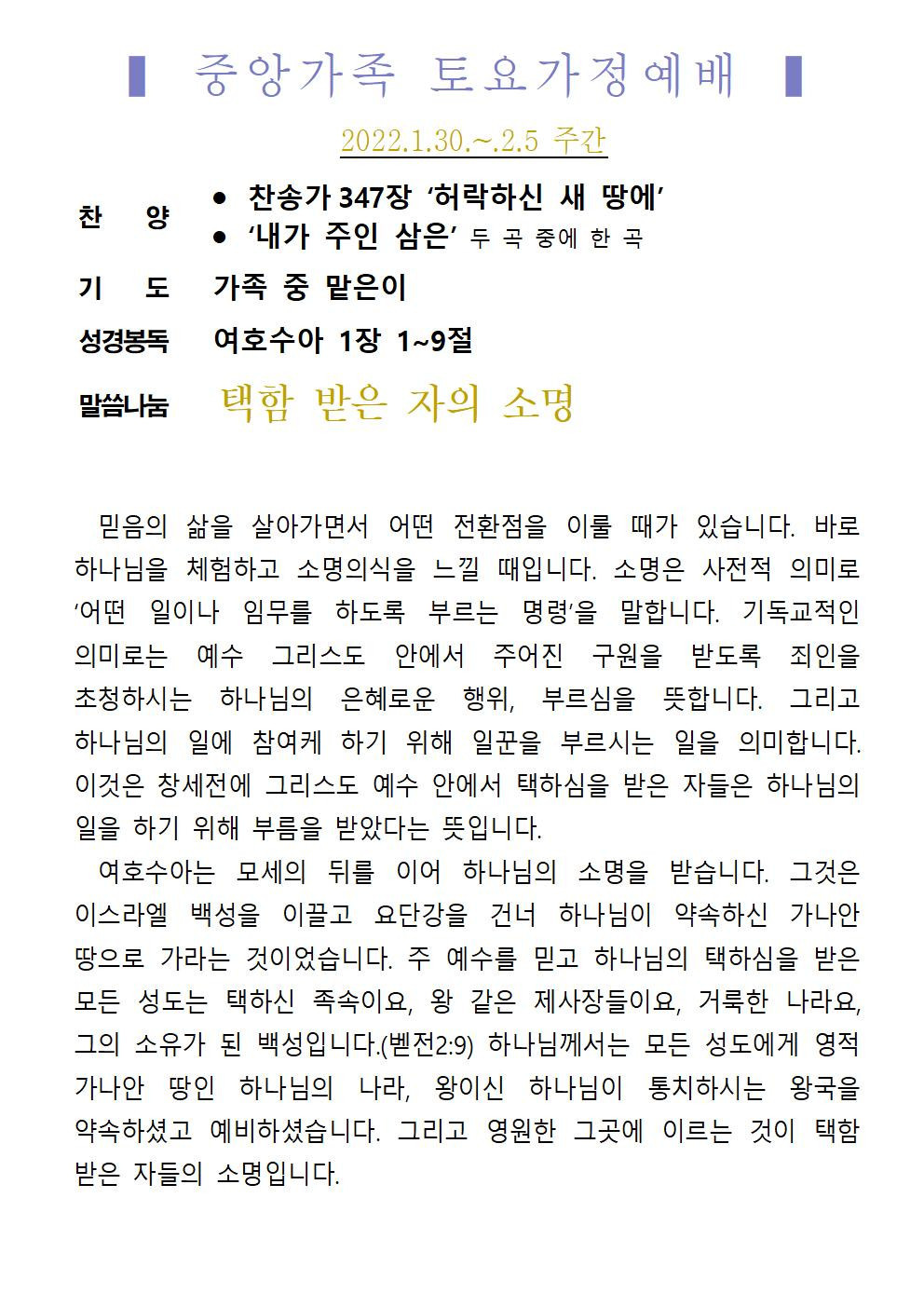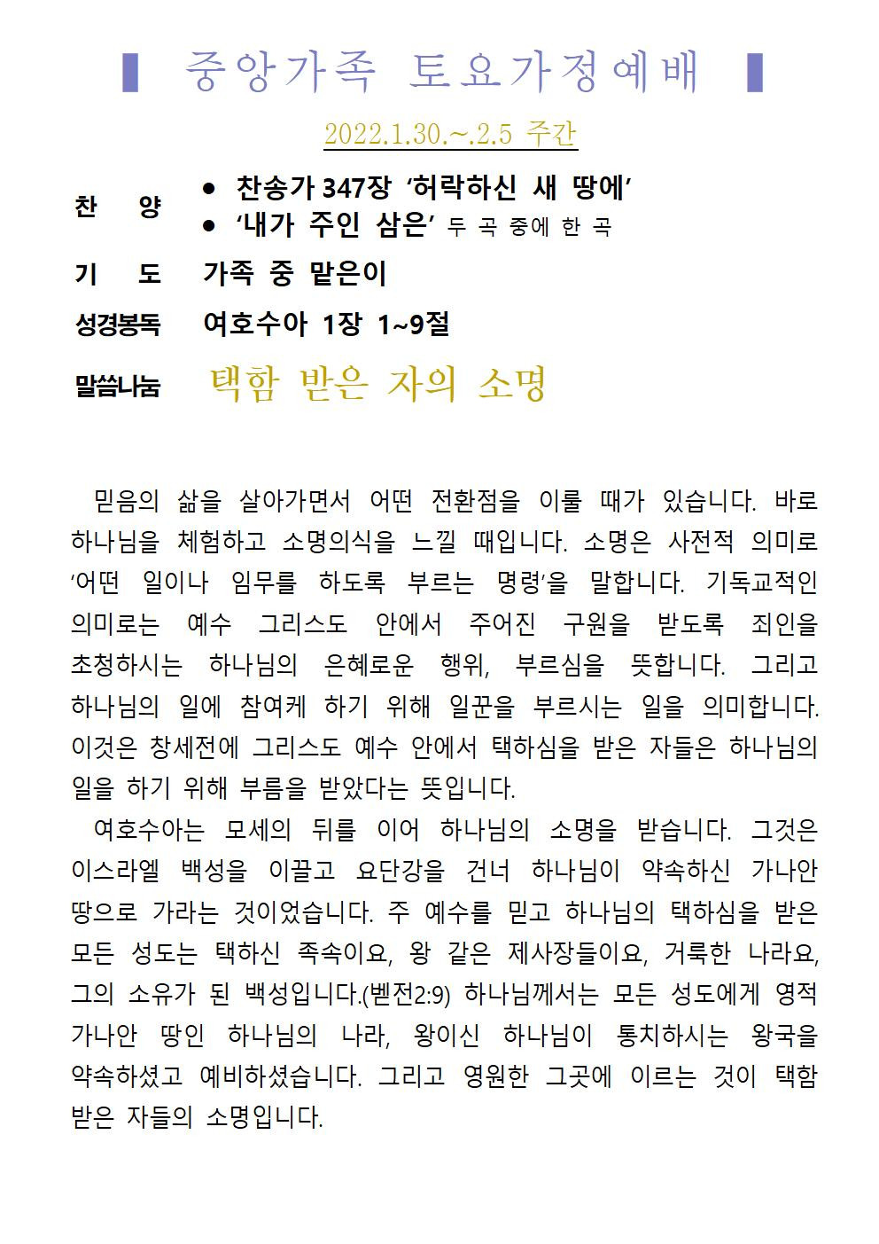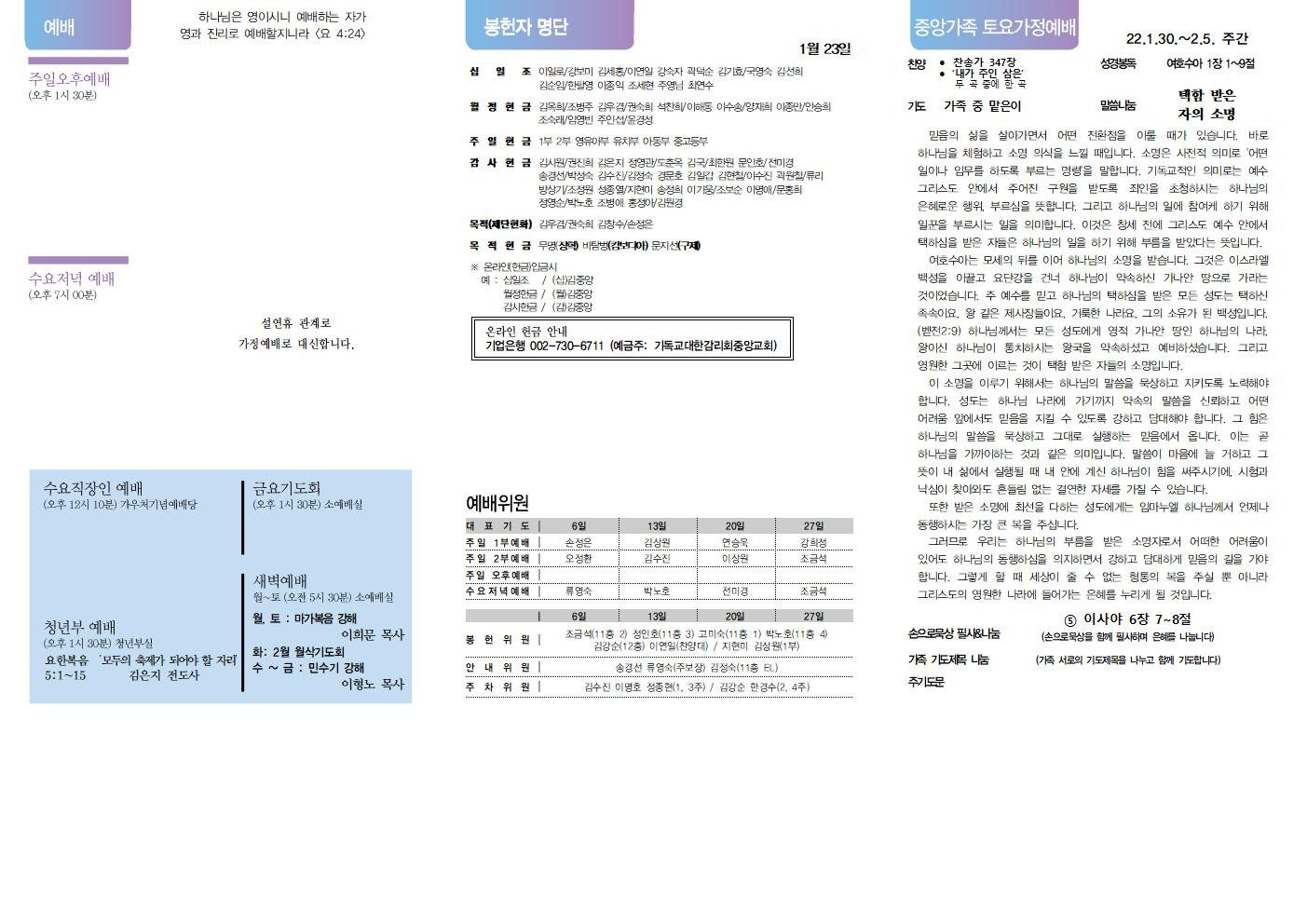 교회소식 교회소식주보 교회소식 주보 교회소식주보 2022년 1월 30일 주일 주보 주보 2022-01-28 오려하 첨부파일 2022주보썸네일.JPG 중앙가족 가정예배서 20220130001.jpg 중앙가족 가정예배서 20220130002.jpg 중앙새주보_220130001.jpg 중앙새주보_220130002.jpg 목록 이전 :: 2022년 설 가정예배서 2022년 2월 6일 주일... :: 다음