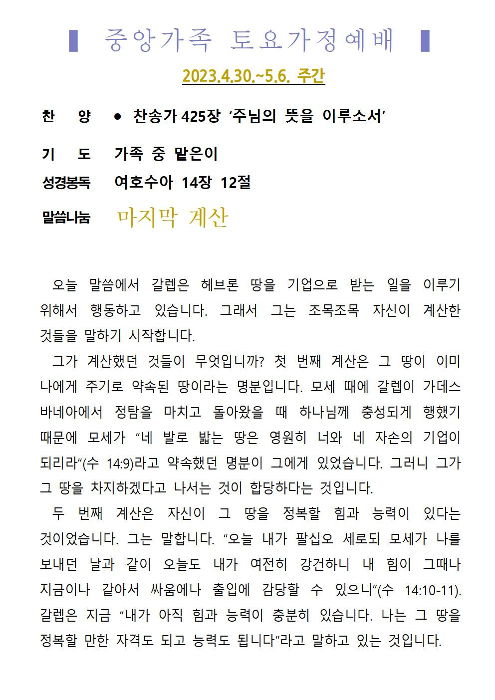 교회소식 교회소식주보 교회소식 주보 교회소식주보 2023년 4월 30일 주일 주보 주보 2023-04-29 김은지 첨부파일 2023주보썸네일.jpg 중앙새주보_230430001.jpg 중앙새주보_230430002.jpg 중앙가족 가정예배서 20230430001.jpg 중앙가족 가정예배서 20230430002.jpg 목록 이전 :: 2023년 4월 23일 주일... 2023년 5월 7일 주일... :: 다음