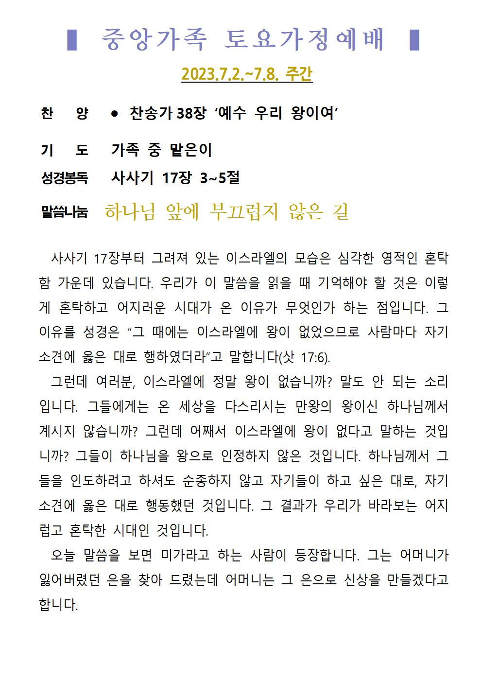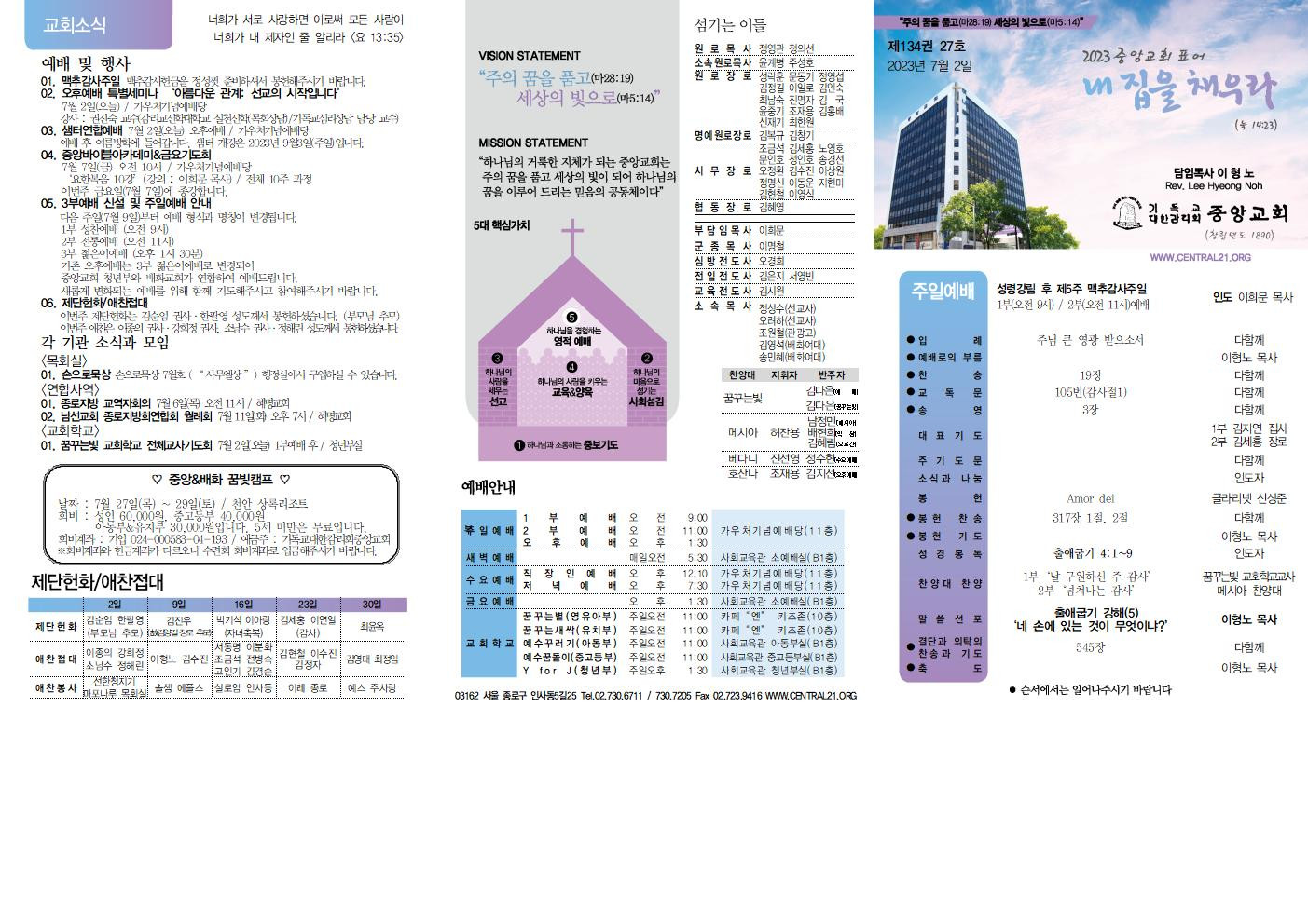 교회소식 교회소식주보 교회소식 주보 교회소식주보 2023년 7월 2일 주일 주보 주보 2023-06-30 김은지 첨부파일 2023주보썸네일.jpg 중앙새주보_230702001.jpg 중앙새주보_230702002.jpg 중앙가족 가정예배서 20230702001.jpg 중앙가족 가정예배서 20230702002.jpg 목록 이전 :: 2023년 6월 25일 주일... 2023년 7월 9일 주일... :: 다음