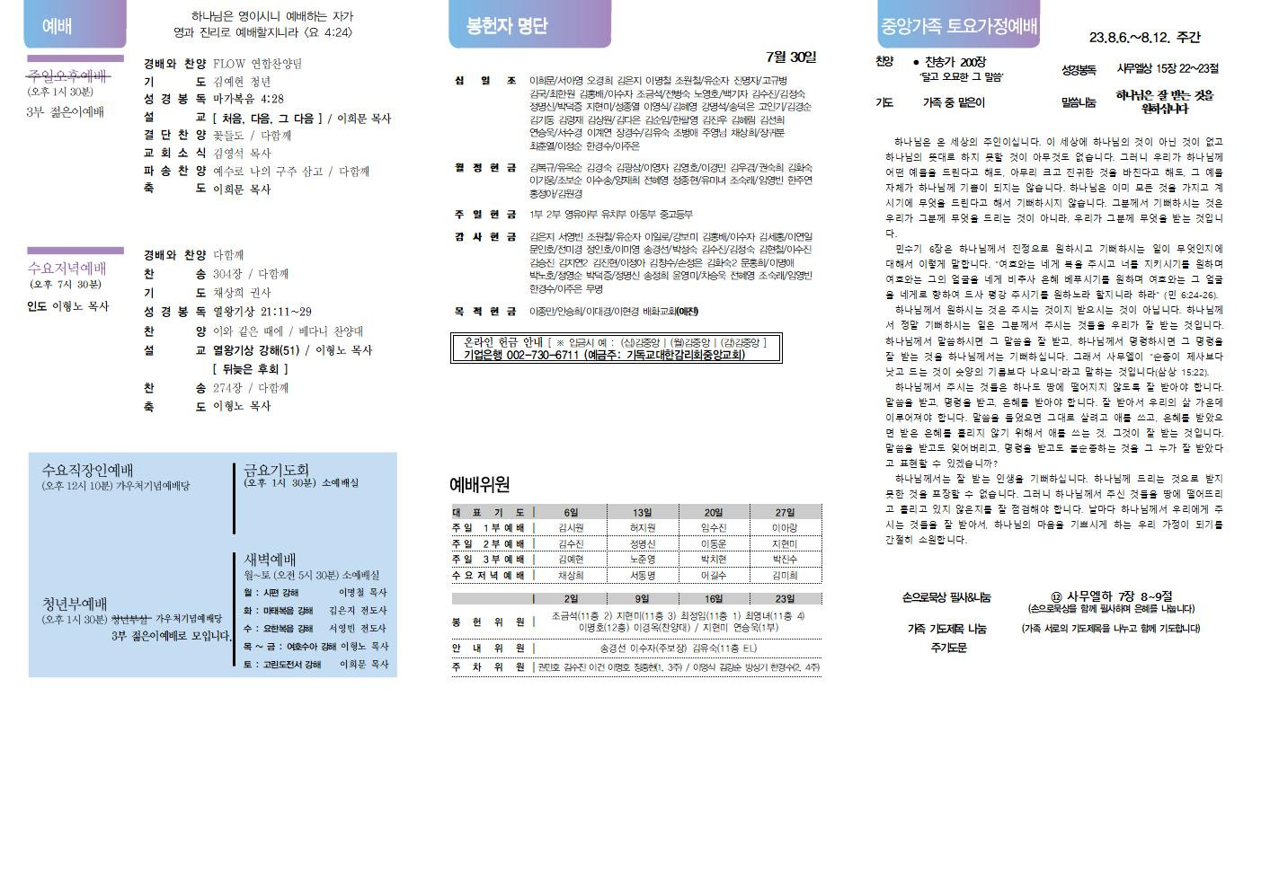 교회소식 교회소식주보 교회소식 주보 교회소식주보 2023년 8월 6일 주일 주보 주보 2023-08-04 김은지 첨부파일 2023주보썸네일.jpg 중앙가족 가정예배서 20230806002.jpg 중앙가족 가정예배서 20230806001.jpg 중앙새주보_230806001.jpg 중앙새주보_230806002.jpg 목록 이전 :: 2023년 7월 30일 주일... 2023년 8월 13일 주일... :: 다음