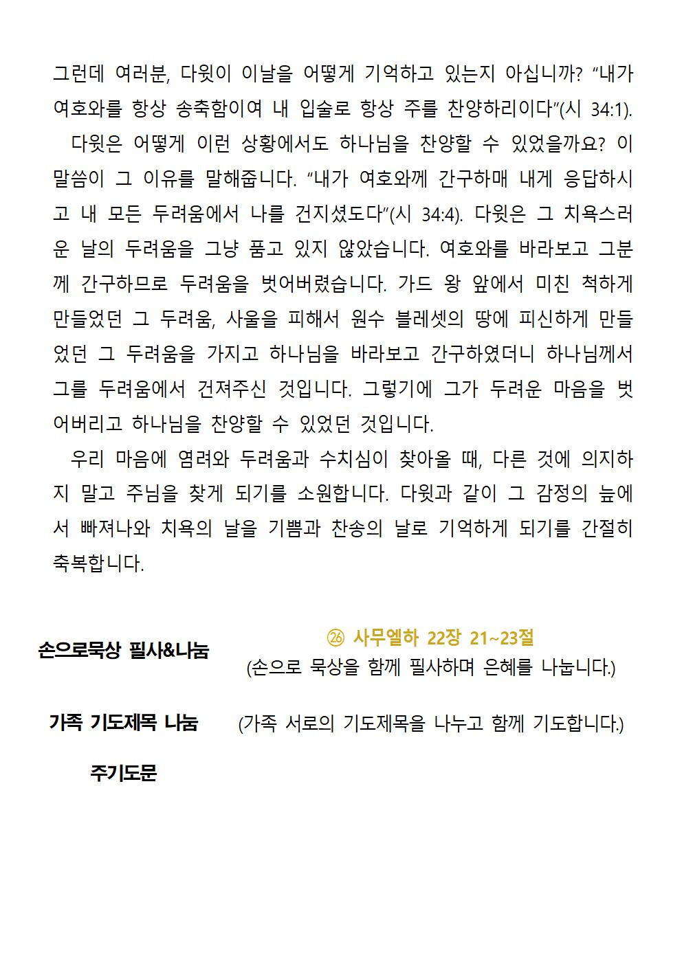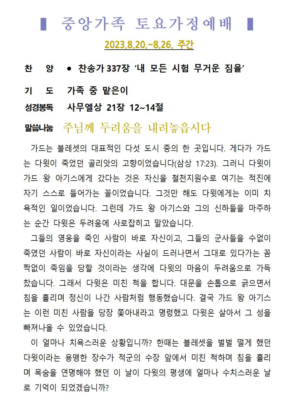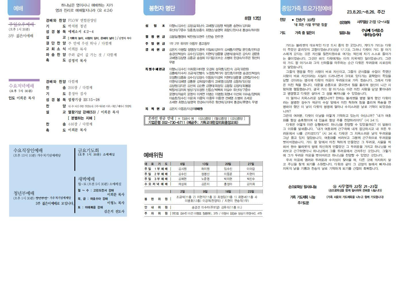 교회소식 교회소식주보 교회소식 주보 교회소식주보 2023년 8월 20일 주일 주보 주보 2023-08-18 김은지 첨부파일 2023주보썸네일.jpg 중앙가족 가정예배서 20230820001.jpg 중앙가족 가정예배서 20230820002.jpg 중앙새주보_230820001.jpg 중앙새주보_230820002.jpg 목록 이전 :: 2023년 8월 13일 주일... 2023년 8월 27일 주일... :: 다음