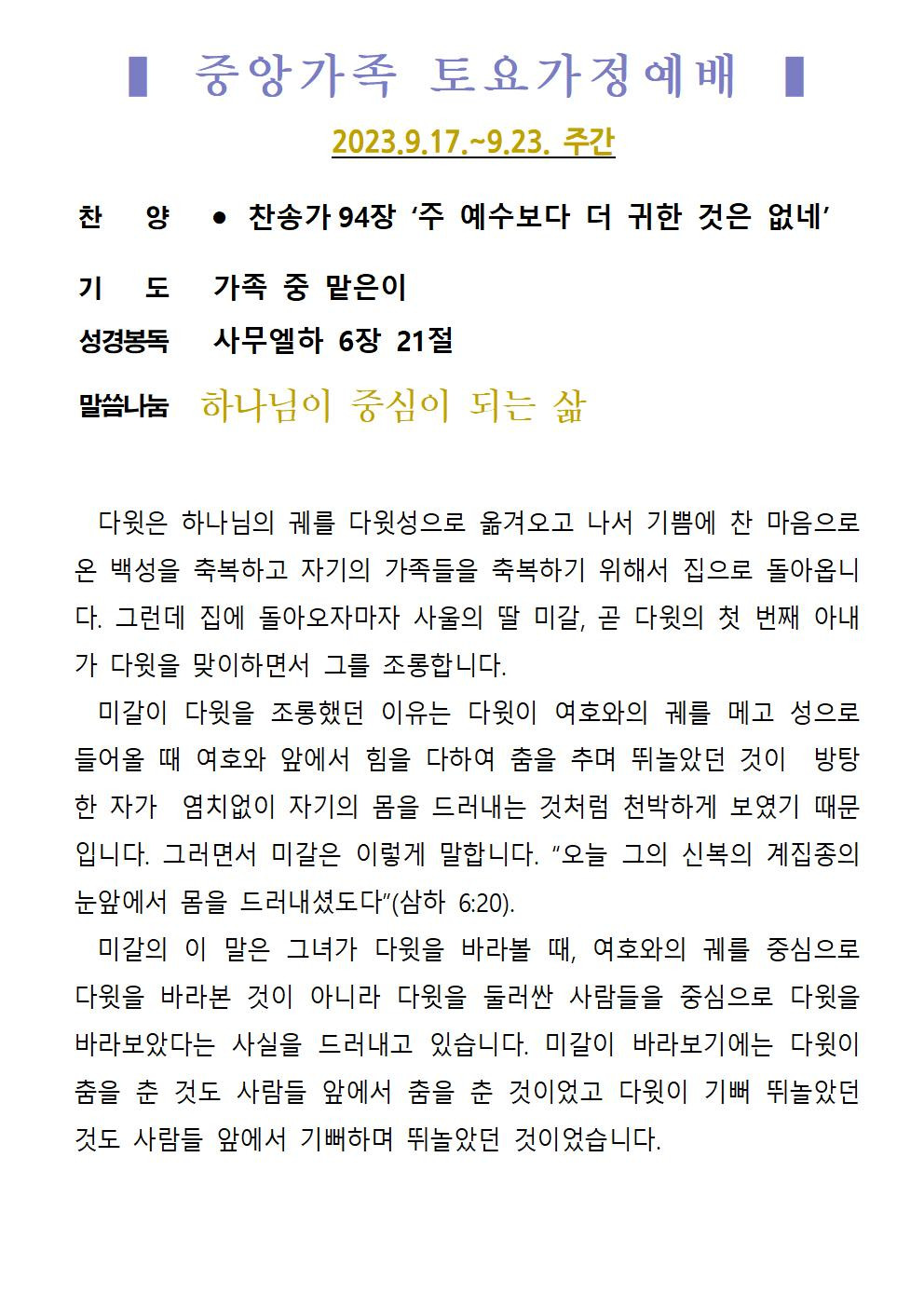 교회소식 교회소식주보 교회소식 주보 교회소식주보 2023년 9월 17일 주일 주보 주보 2023-09-15 김은지 첨부파일 2023주보썸네일.jpg 중앙가족 가정예배서 20230917002.jpg 중앙가족 가정예배서 20230917001.jpg 중앙새주보_230917002.jpg 중앙새주보_230917001.jpg 목록 이전 :: 2023년 9월 10일 주일... 2023년 9월 24일 주일... :: 다음