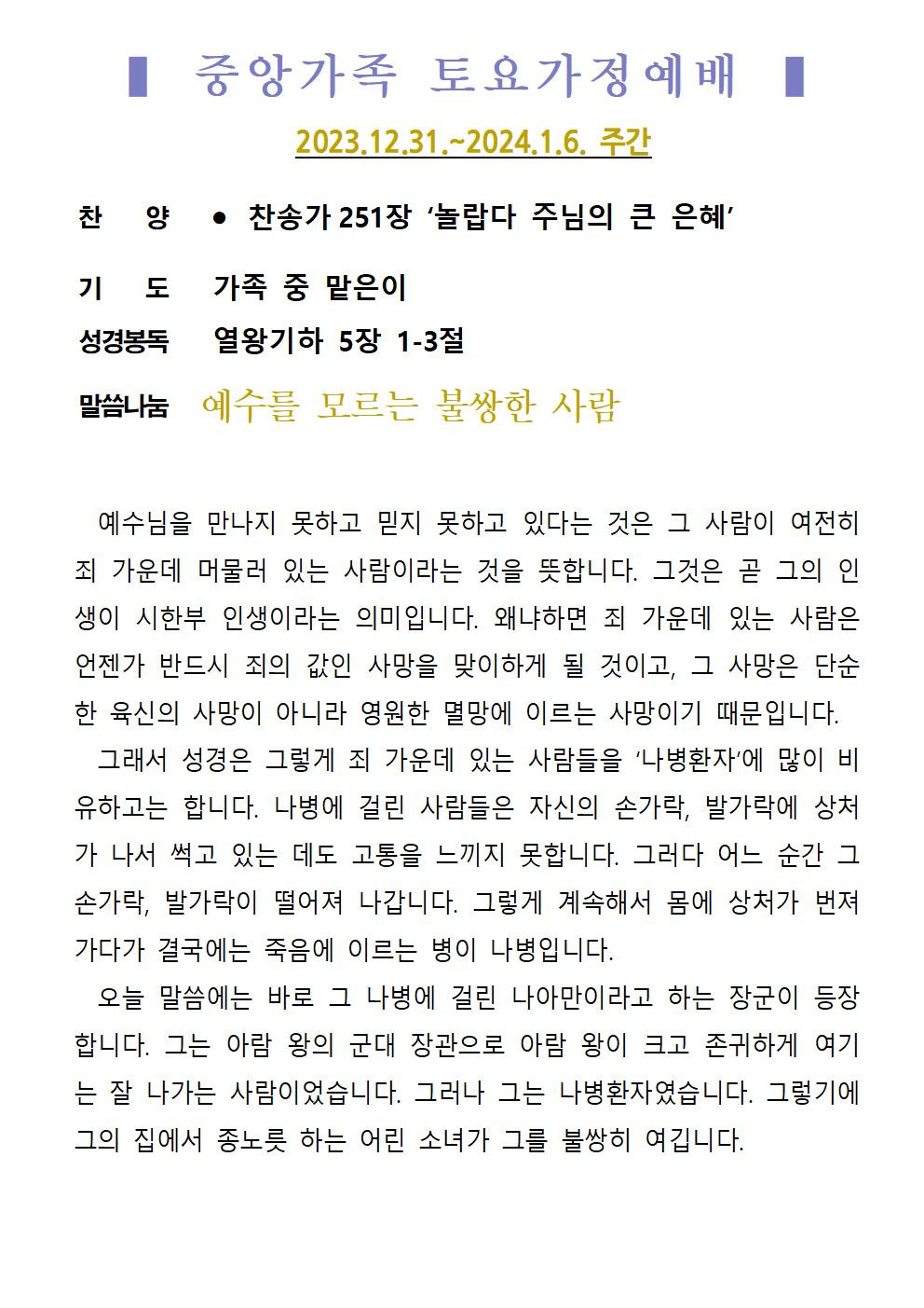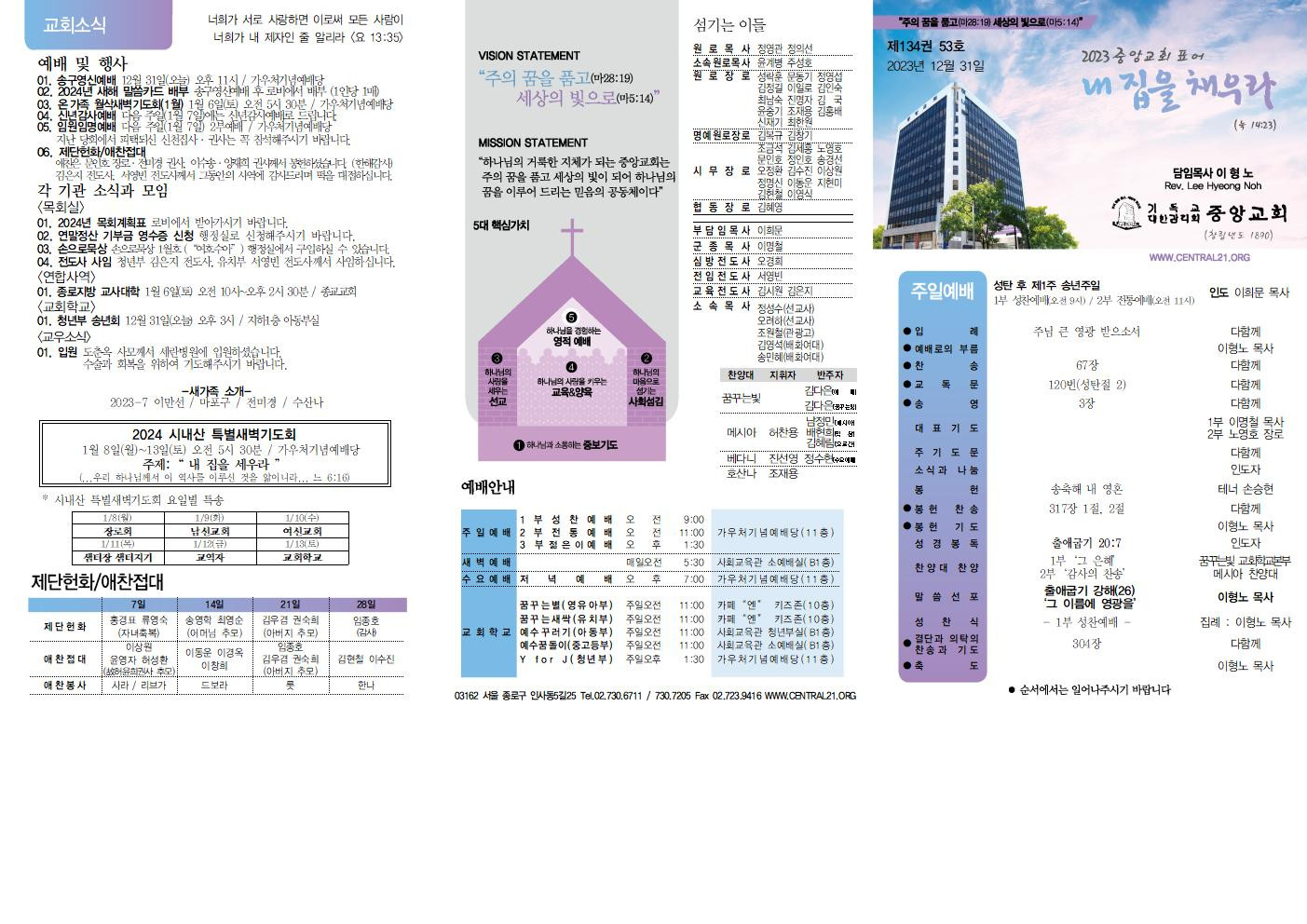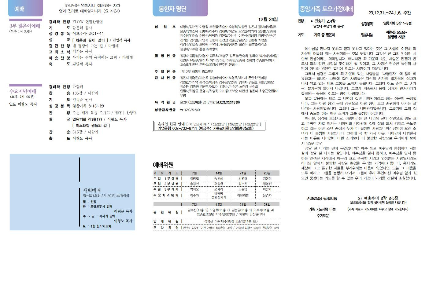 교회소식 교회소식주보 교회소식 주보 교회소식주보 2023년 12월 31일 주일 주보 주보 2023-12-29 김은지 첨부파일 2023주보썸네일.jpg 중앙가족 가정예배서 20231231001.jpg 중앙가족 가정예배서 20231231002.jpg 중앙새주보_231231002.jpg 중앙새주보_231231001.jpg 목록 이전 :: 2023년 12월 24일 주... 2024년 1월 7일 주일... :: 다음