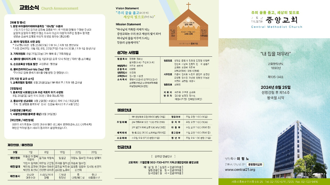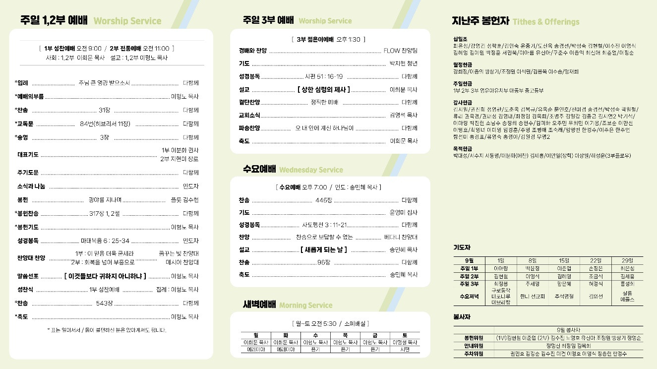 교회소식 교회소식주보 교회소식 주보 교회소식주보 2024년 8월 25일 주일 주보 2024-08-31 오려하 첨부파일 8.25 앞.jpg 8.25 뒷.jpg 목록 이전 :: 2024년 8월 18일 주일 2024년 9월 1일 주일 :: 다음