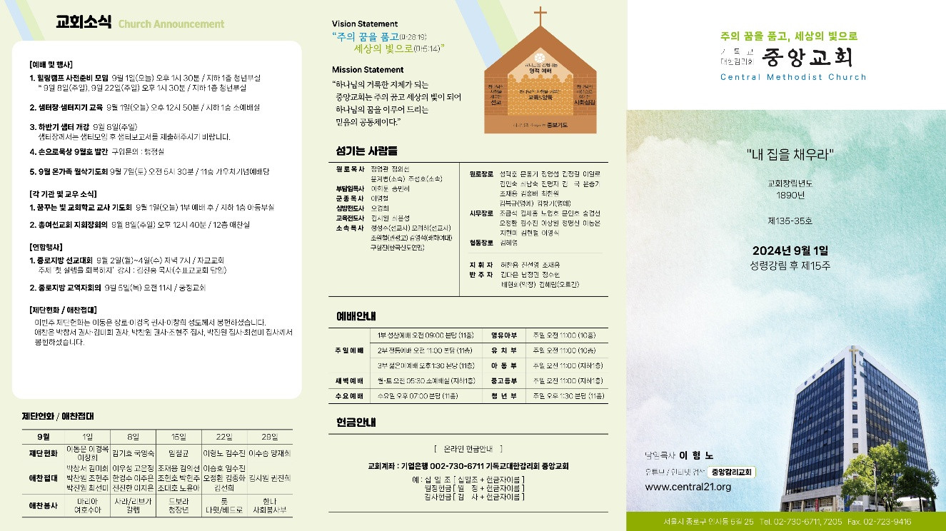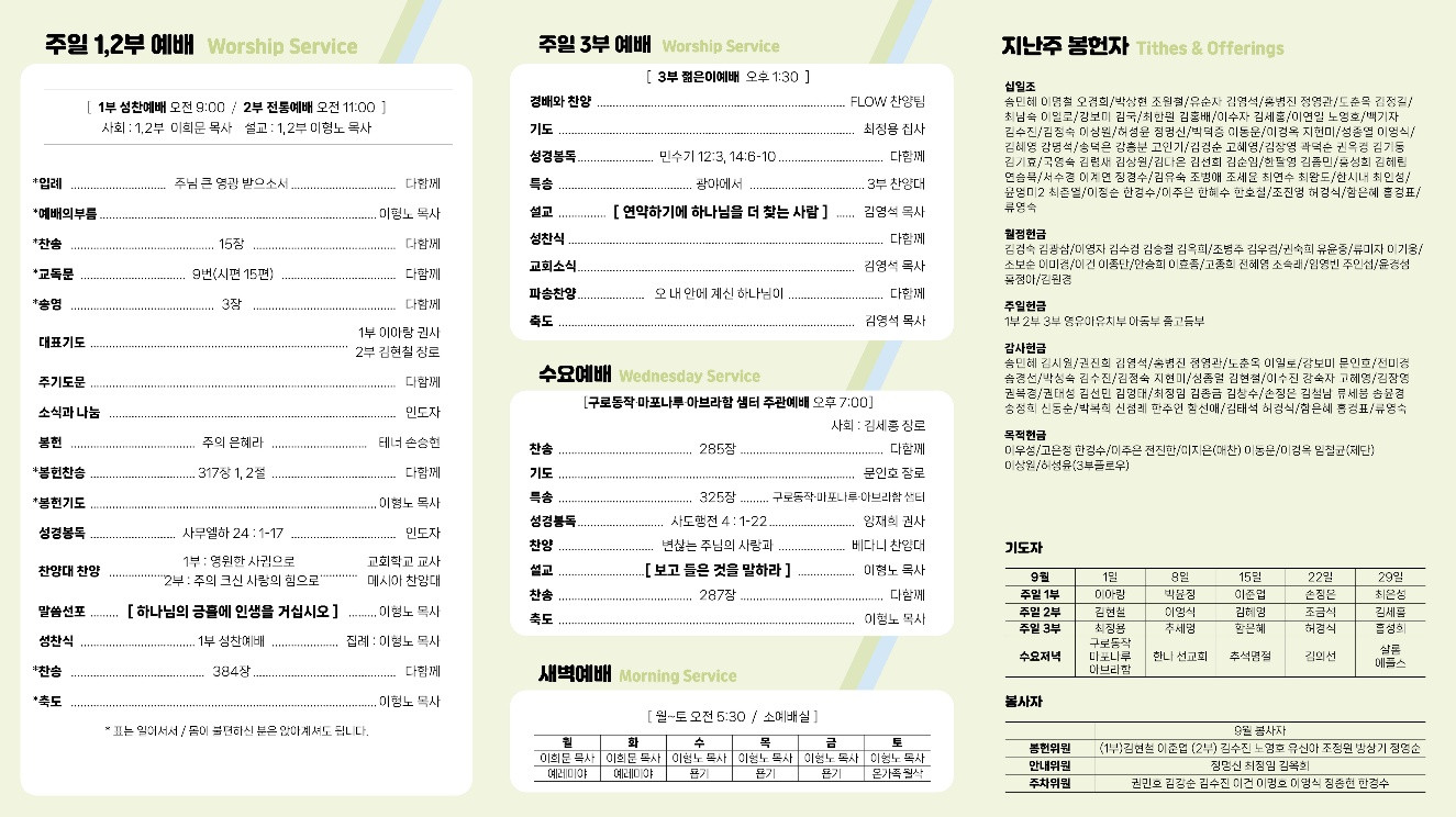 교회소식 교회소식주보 교회소식 주보 교회소식주보 2024년 9월 1일 주일 주보 2024-08-31 오려하 첨부파일 9.1 앞.jpg 9.1 뒷.jpg 목록 이전 :: 2024년 8월 25일 주일 2024년 9월 8일 주일 :: 다음