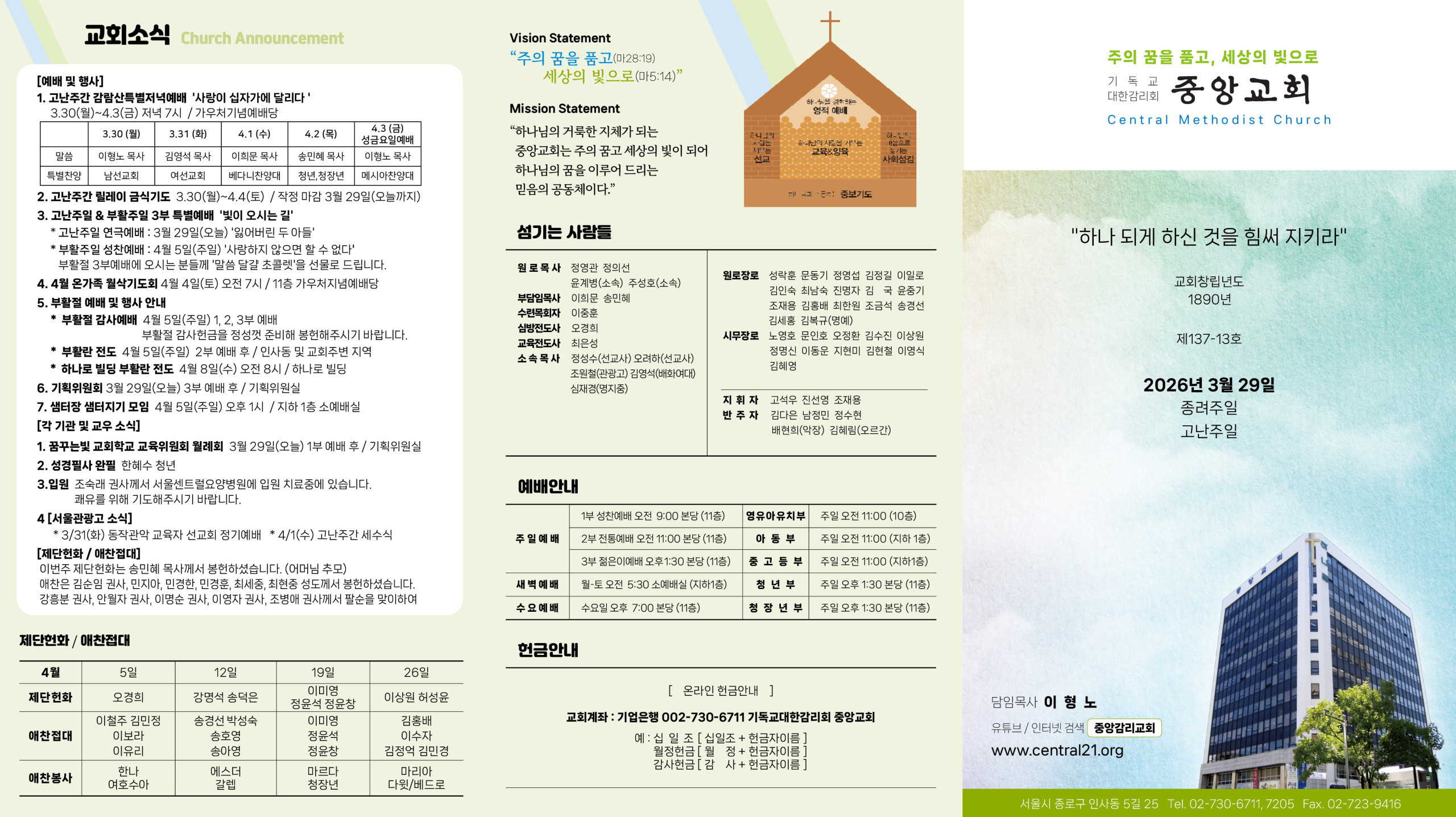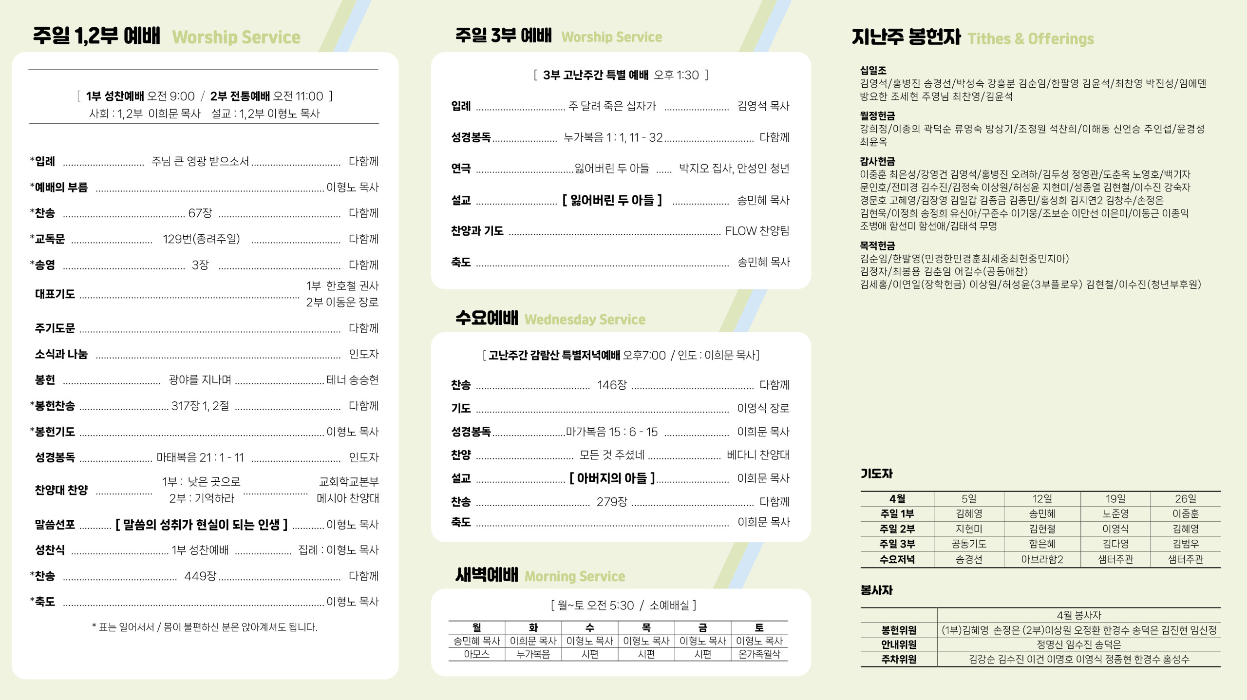 교회소식 교회소식주보 교회소식 주보 교회소식주보 2026년 3월 29일 주일 주보 2026-03-28 이중훈 첨부파일 20260329.jpg 202603292.jpg 목록 이전 :: 2026년 3월 22일 주일